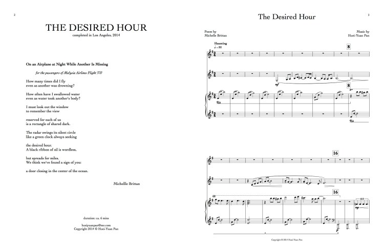 The creative spark for “The Desired Hour” began with a poem by my incredibly talented writer friend, Michelle Brittan. It was my introduction to a style of writing called poetry of witness, which offers a writer’s historical and cultural testimony in poetic form. Michelle had written the poem mid-flight, later explaining to me how she was moved by the story currently in the news about the missing Malaysian Airlines Flight 370. In her words: