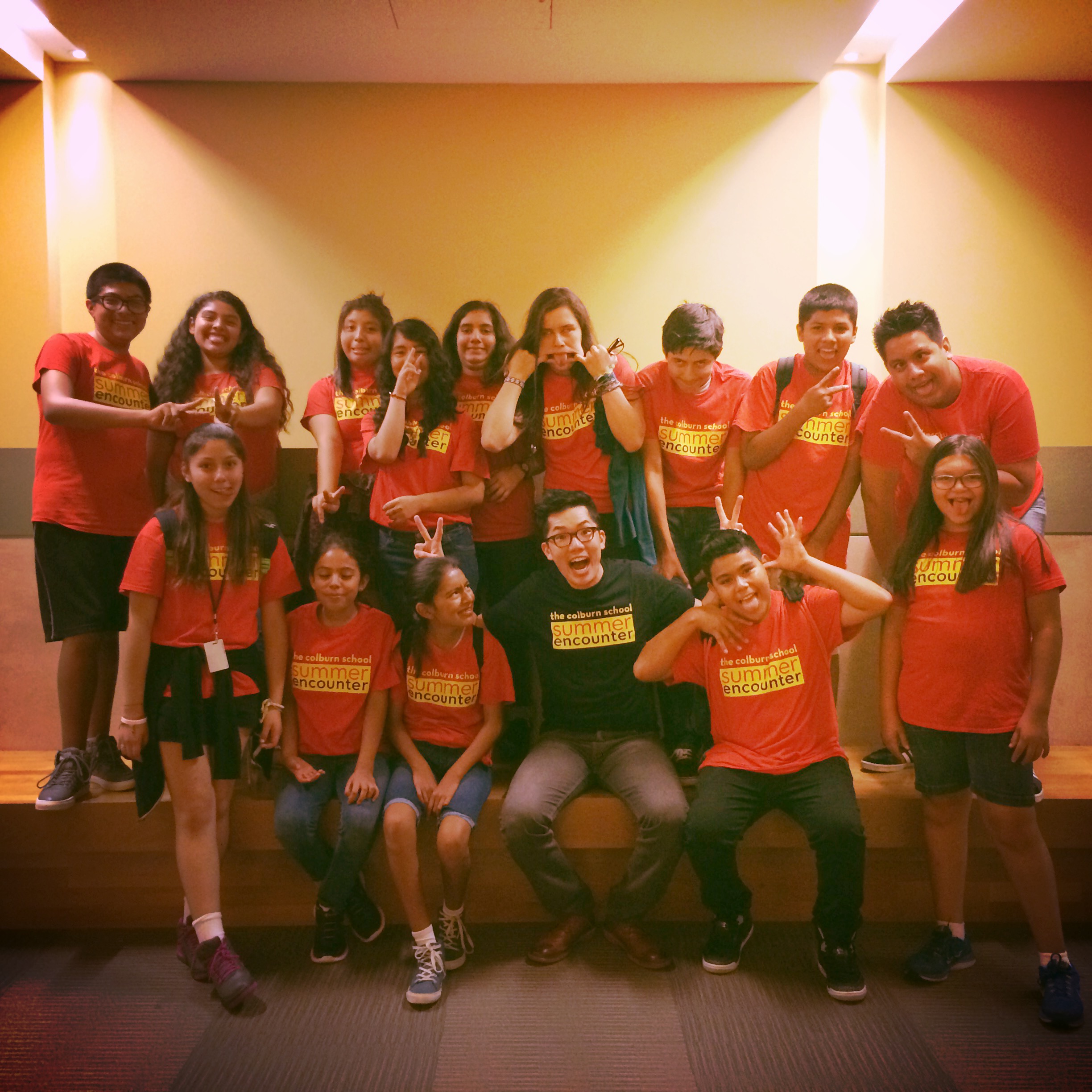 Summer Encounter at Colburn brings 60 students from our 15 surrounding partners to campus for 2 weeks of immerssive classes in dancing, drama, singing and instrumental music. The Jumpstart students came in for an afternoon performance to demonstrate how much can be accomplished in just 2 years of instrumental study. After inspiring the next generation of Jumpstart Young Musicians Program participants, we stop to pose for a group photo. Of course we also had to take a silly one.